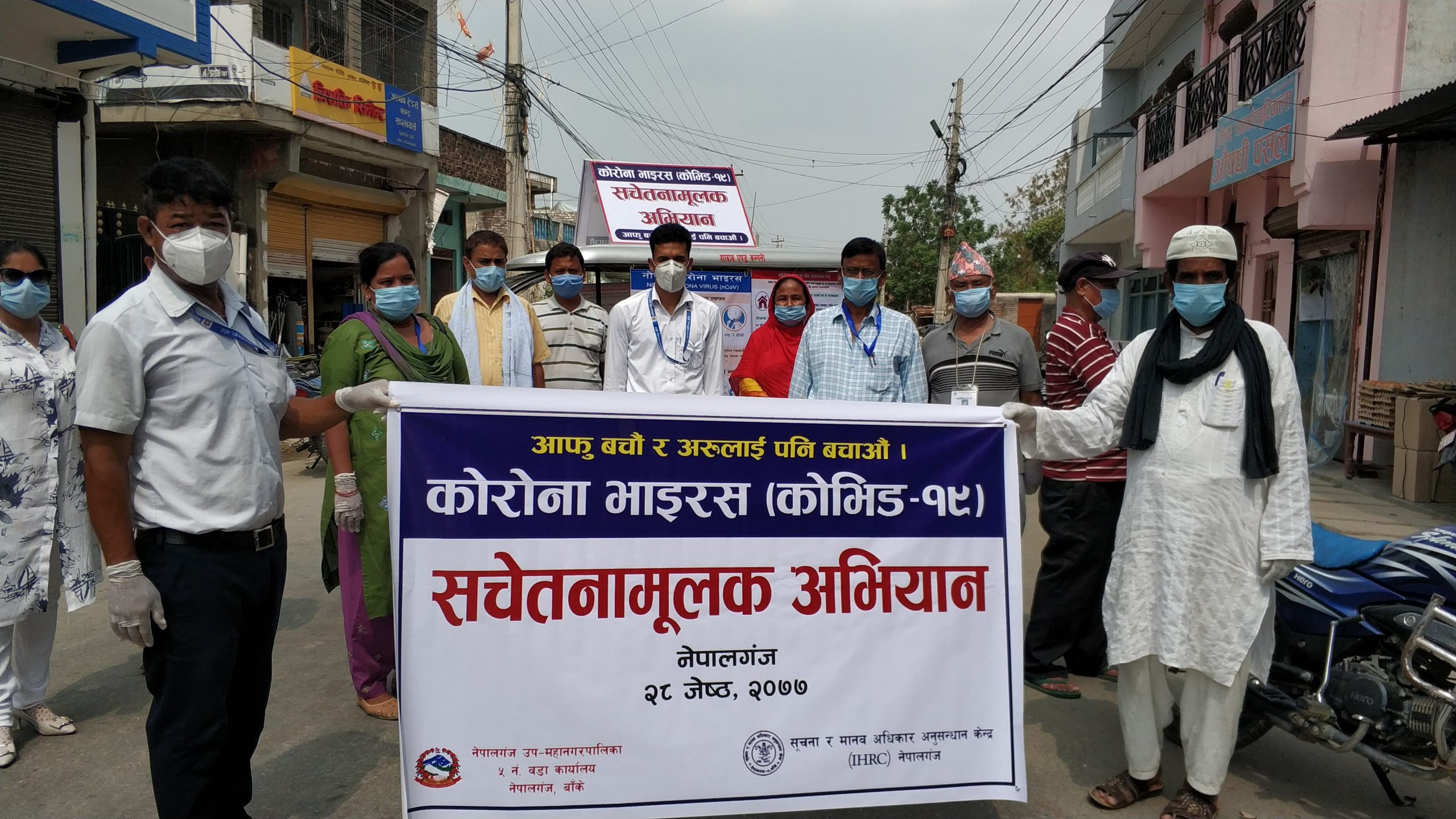 नेपालगन्ज: कोरोना भाइरसविरुद्ध नेपालगन्जमा सचेतनामुलक अभियान संचालन गरिएको छ । नेपालगन्ज ५ नं. वडा कार्यालय र सूचना र मानव अधिकार अनुसन्धान केन्द्र नेपालगन्जद्धारा वडामा कोभिड–१९ को संक्रमणबाट बच्नका लागि अभियान थालिएको हो ।