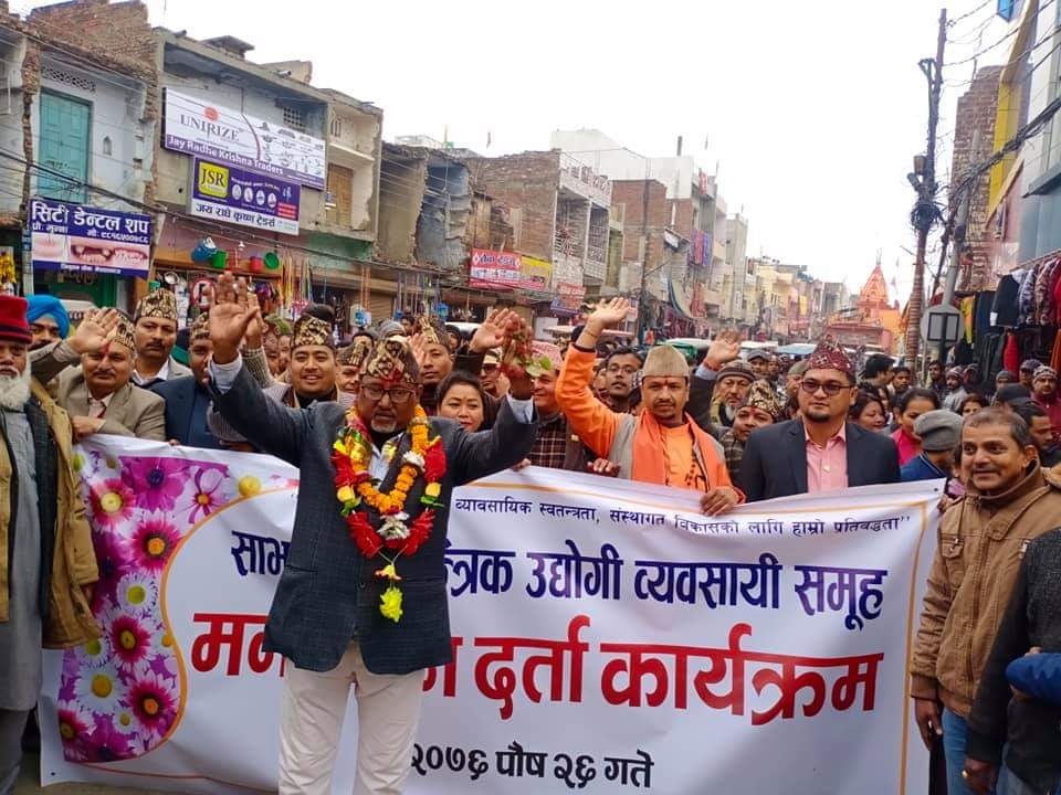साझा प्रजातान्त्रिक उद्योगी व्यावसायी समूहको सचिवालयमा भेला भएका सयौं उद्योगी व्यावसायी न्यूरोड, धम्वोजी, घरबारी टोल, त्रिबेणीमोड हुँदै मनोनयन दर्तास्थल उद्योग बाणिज्य संघको कार्यालय त्रिभुवन चोक पुगेर उमेदवारले उमेदवारी दर्ता गराएका थिए ।