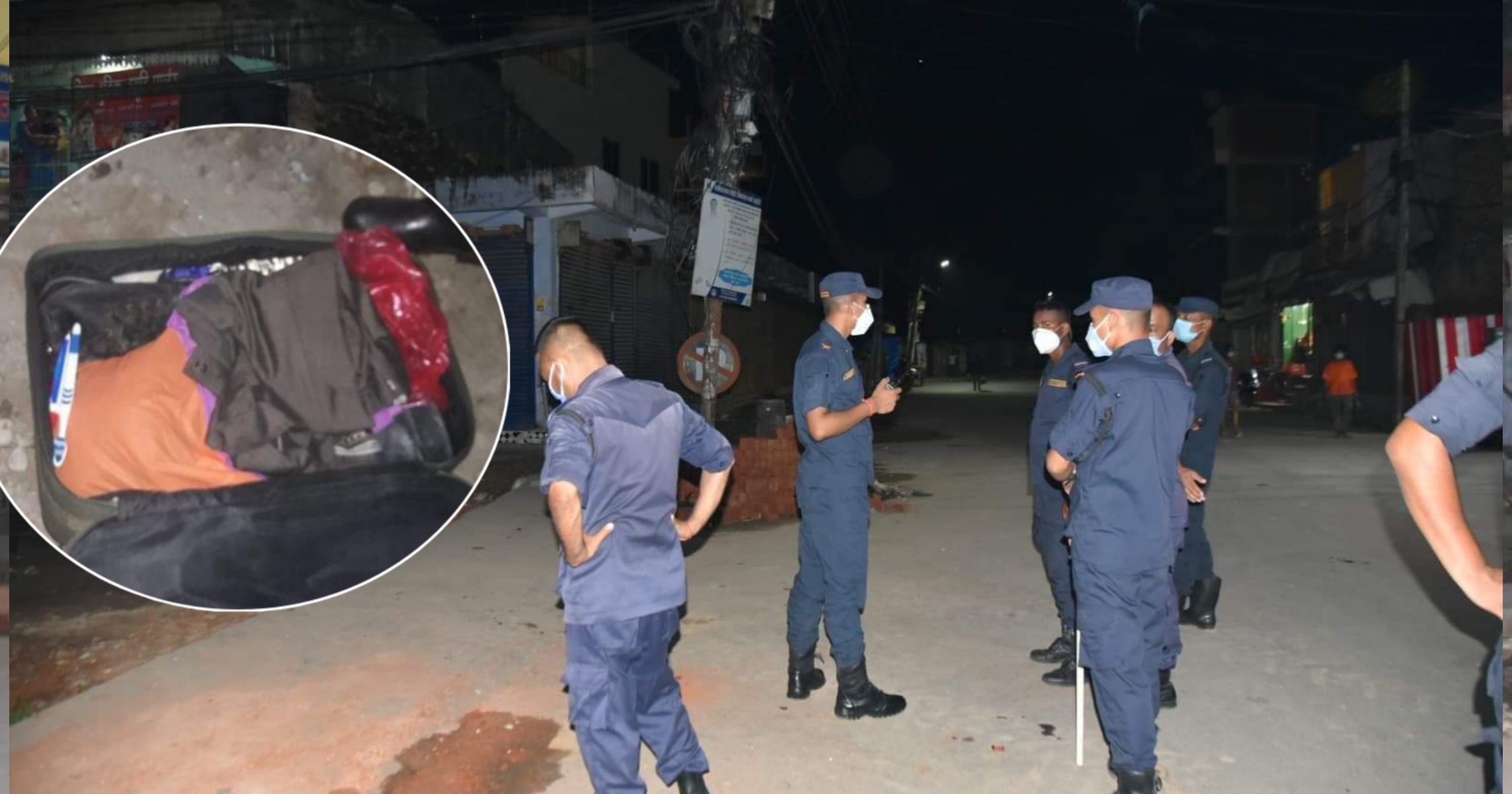 माेडकाे उत्तर पश्चिम पट्टी घर अगाडिको चाैताराेमा शुटकेश फेला परेपछि स्थानीयले प्रहरीलाई खबर गरेका थिए । लगत्तै पुगेकाे प्रहरीले साे क्षेत्रमा सावधानी अपनाएकाे थियाे ।