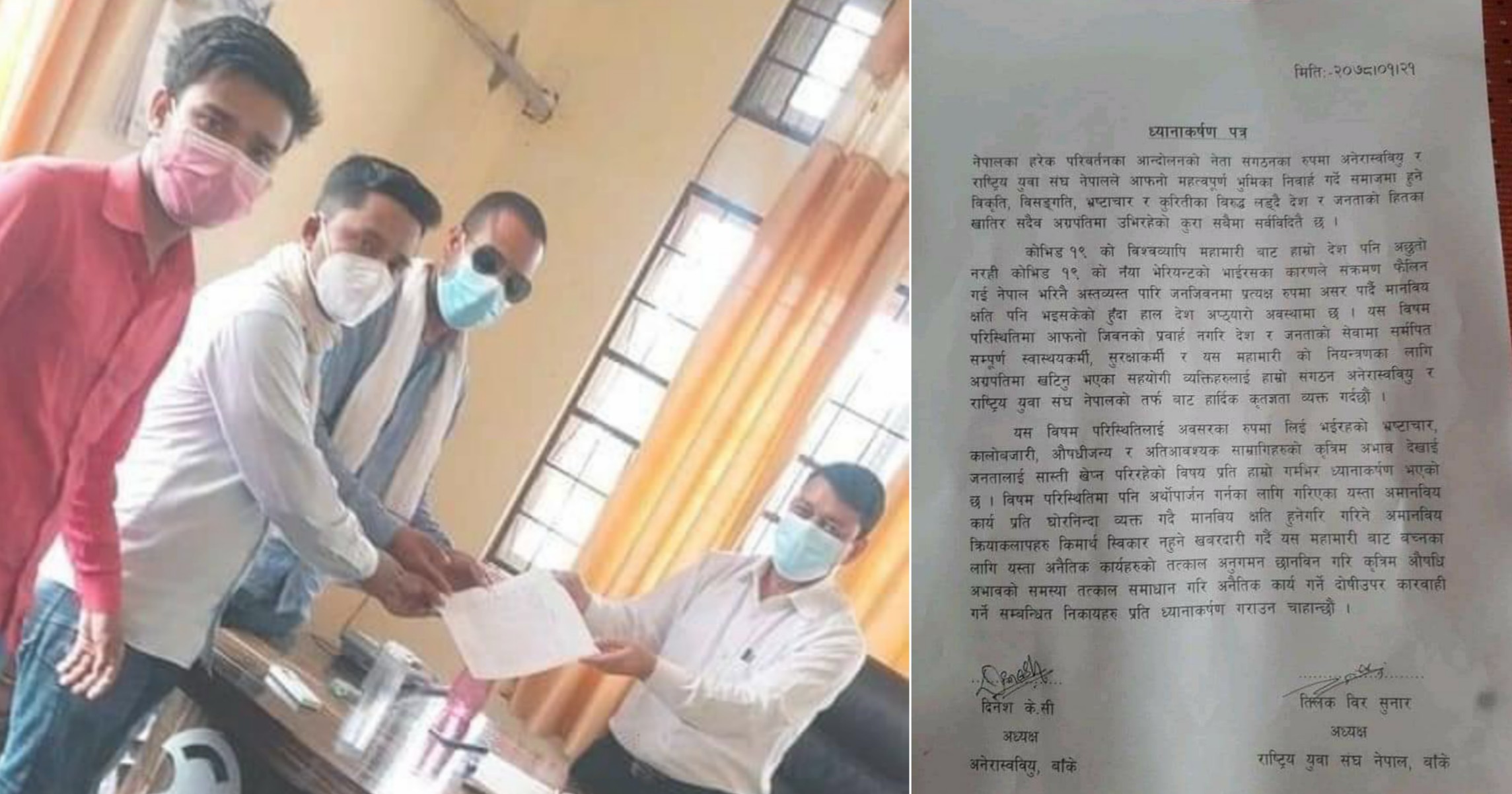 रास्ट्रिय युवा संघ नेपाल बाँकेका अध्यक्ष तिलक वीर सुनार र अनेरास्ववियु बाँकेका अध्यक्ष दिनेश केसीले हस्तान्तरण गरिएको ध्यानाकर्षण पत्रमा बाँकेको कोरोना कहरमा फ्रन्ट लाइनमा रहेर कार्य गर्ने स्वास्थ्यकर्मी, सुरक्षाकर्मी तथा सहयोगी हातहरुलाई धन्यवाद समेत भनिएको छ ।