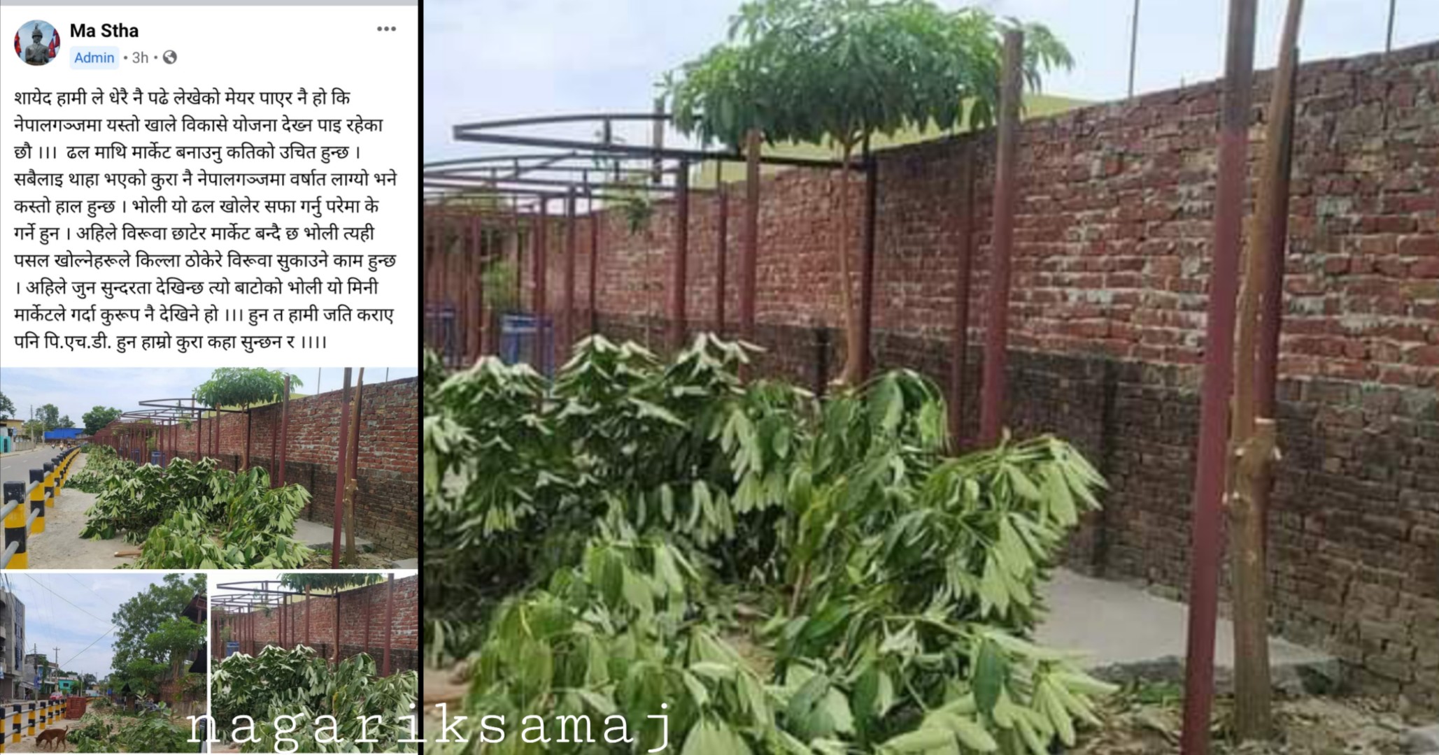नेपालगन्ज उपमहानगरपालिकाले बिटिएस रोडमा औद्योगिक क्षेत्र तर्फको फुटपाथमा मिनि मार्केट बनाउने स्थलमा त्यहाँ रहेका रुखा काटछाट पारेको दृश्य (फोटो र भिडियो) सामाजिक संजालमा पोस्ट गर्दै त्यस कार्यको व्यापक बिरोध सुरु भएको हो ।