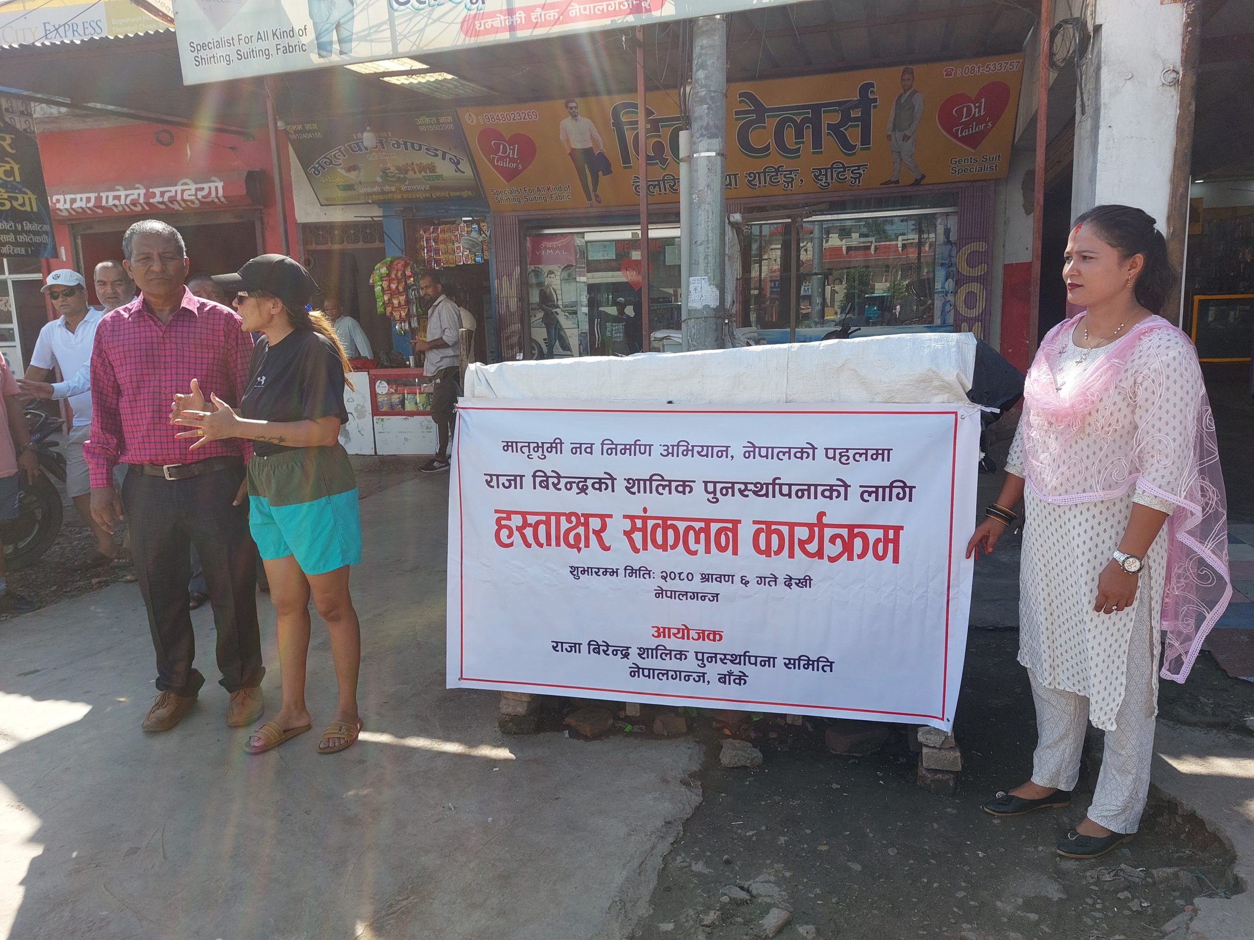 नेपालगन्जको बिरेन्द्र चोकमा राजा बिरेन्द्रको शालिक जुनसुकै परिस्थितमा पनि पुनर्स्थापना गरिने जानकारी गराउदै सम्बन्धित सबैलाई रचनात्मक सहयोग र ऐक्यबद्धता जाहेर गरिदिनुहुन आव्हान गर्दै अभियानका संयोजक तेज बिक्रम शाहले हस्ताक्षर अभियान पछि वडा स्थतरमा अभियान पुग्ने बताएका छन् ।